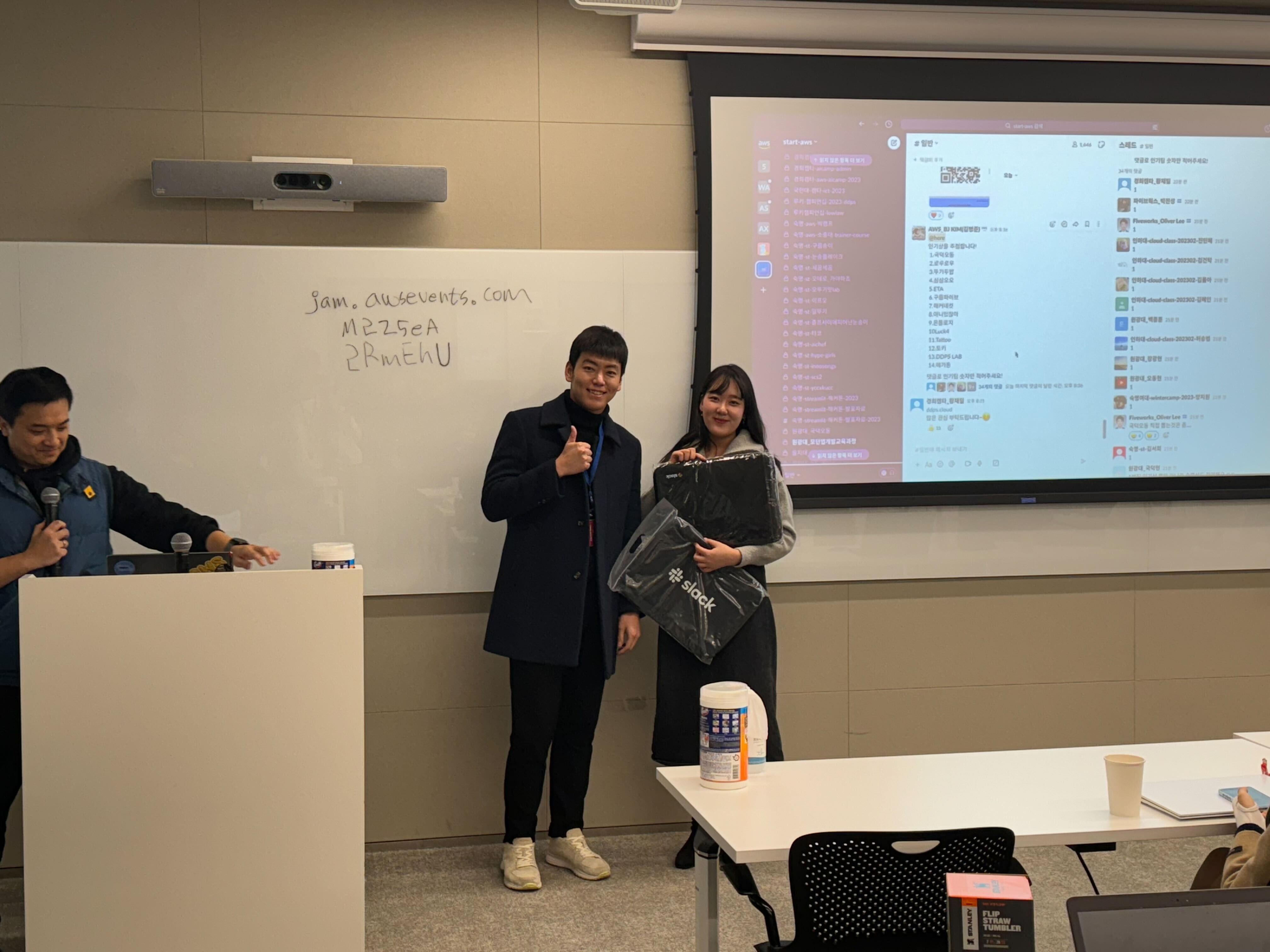 2등팀 발표가 나왔다. 2등 상은 Slack상이었다. Slack 상은 특이하게 두 개 팀을 선정했는데, 첫 번째 상에서 역시나 다른 팀이 호명됐다. 자리에 앉아서 오매불망 내 이름이 불리기만을 기다리고 있었다. 그러다가 두 번째 상을 발표할 때 드디어 내 이름이 호명됐다. 좋은건지 뭔지 아무튼 얼떨떨한 기분이었다. 얼떨떨한 와중에도 발은 착실하게 강단으로 뛰어 나가고 있었다.